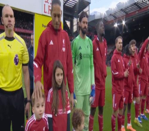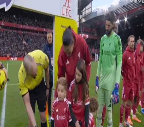 他们的出现让比赛显得温情脉脉,范戴克躬身向孩子们示意,与裁判组击掌,而三名裁判也俯身与两名孩子击掌。